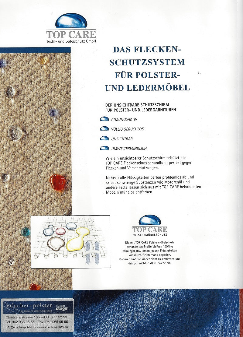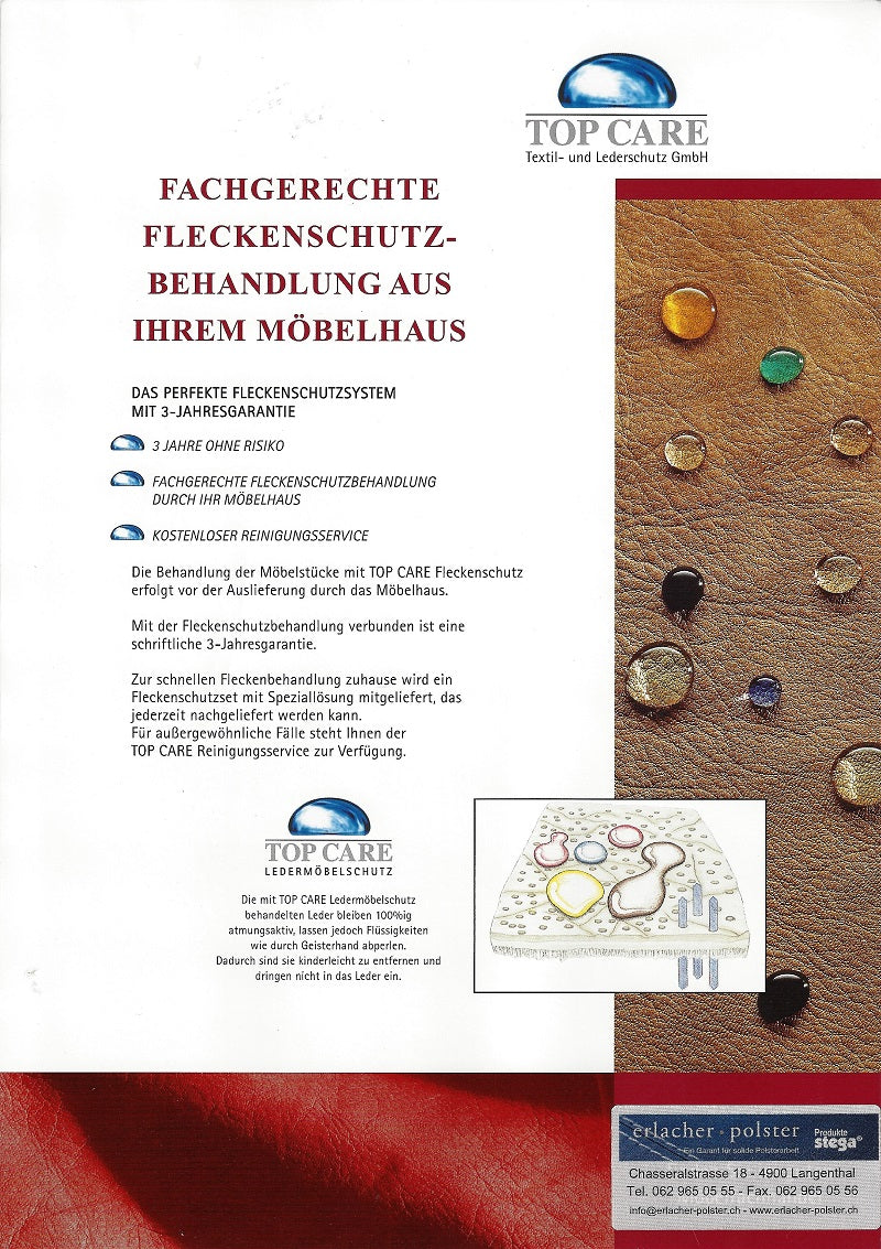 Schnell kann ein verschüttetes Glas Rotwein oder ein Spritzer Schokoladencrème auf Ihrem Lieblingsmöbel zur delikaten Angelegenheit werden. Dank der Fleckenschutzbehandlung von TOP CARE bleibt aber trotz Missgeschick alles schick. Unser innovatives Verfahren schützt jede einzelne Gewebefaser, indem es das Eindringen von Flüssigkeit und das Haften von Schmutz verhindert. Eigenschaften wie Atmungsaktivität, Geschmeidigkeit und Griff der Stoffe und Leder bleiben unverändert.