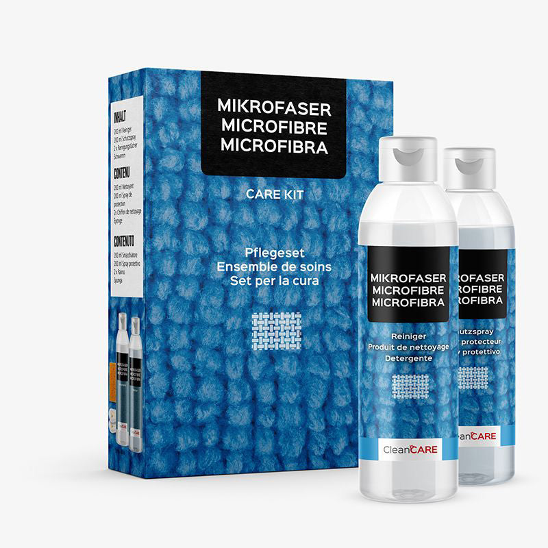 Das Pflegeset umfasst zwei Produkte: Reiniger und Schutzspray. Der Reiniger auf Wasserbasis entfernt gängige Flecken, die durch den täglichen Gebrauch entstehen. Der Reiniger ist sowohl für natürliche und synthetische Fasern als auch Misch- und Mikrofasern geeignet. Für die Reinigung müssen die Polster Ihrer Textilmöbel nicht mehr abgenommen werden. Das Schutzspray auf Wasserbasis schützt Flecken durch Lebensmittel, Fett und Schweiss vor.